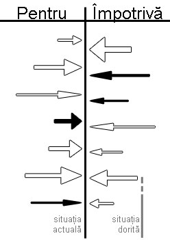 2 Iei o foaie de hârtie, o împarți în două și te apuci să desenezi niște săgeți, în partea stângă forţele conducătoare şi în partea dreaptă forţele de rezistenţă. Fiecare forţă are o anumită intensitate ce va fi reprezentată printr-un număr de la 1 la 10 pentru forţele pozitive şi de la -1 la -10 pentru cele negative.